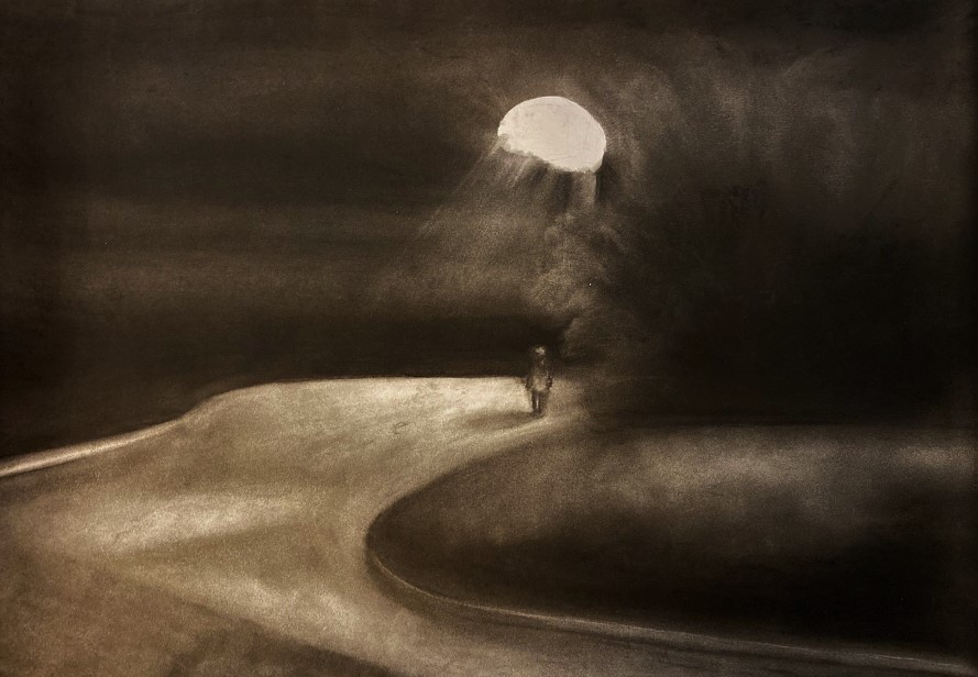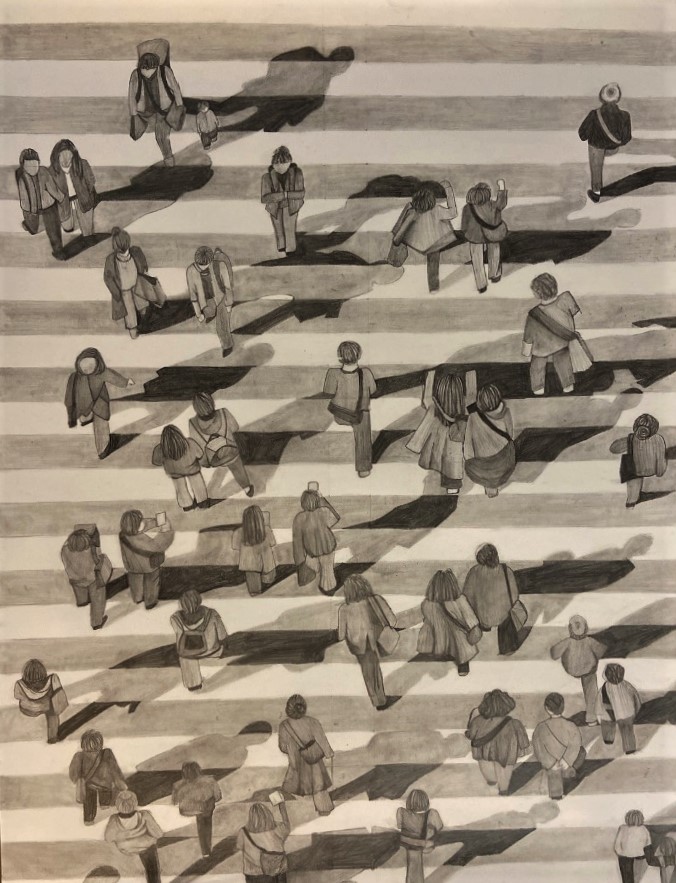 Ombres et Lumières Passage, crayons HB et 2B, format aigle, travail sur la foule. Nuit, fusain, format A3, travail sur la réserve.